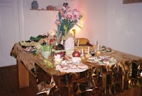 A Christmas dinner party for our friends. Potatoes as candle holders and leak as flowers. The table became the central part of the party, a continuous snacking adventure until people wore cale leafs as hats.